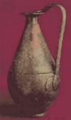 trompeta y asa trilobulada rematada en una palmeta de tipología fenicia sobre el cuerpo y en tres cabezas de serpiente sobre el borde de la boca. Se data a mediados del siglo