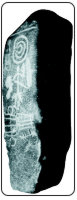 Estela de guerrero trabajada por incisión y abrasión superficial. El escudo en la parte superior y el carro ligero en la inferior
