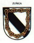 cuatro gradas de lo mismo, mazonado de sable, acompañado en los cantones y en la punta de cinco cigüeñas de plata, picadas de gules y las patas de lo mismo, que llevan en el pico una sierpe de oro. A1 timbre, corona real cerrada”.